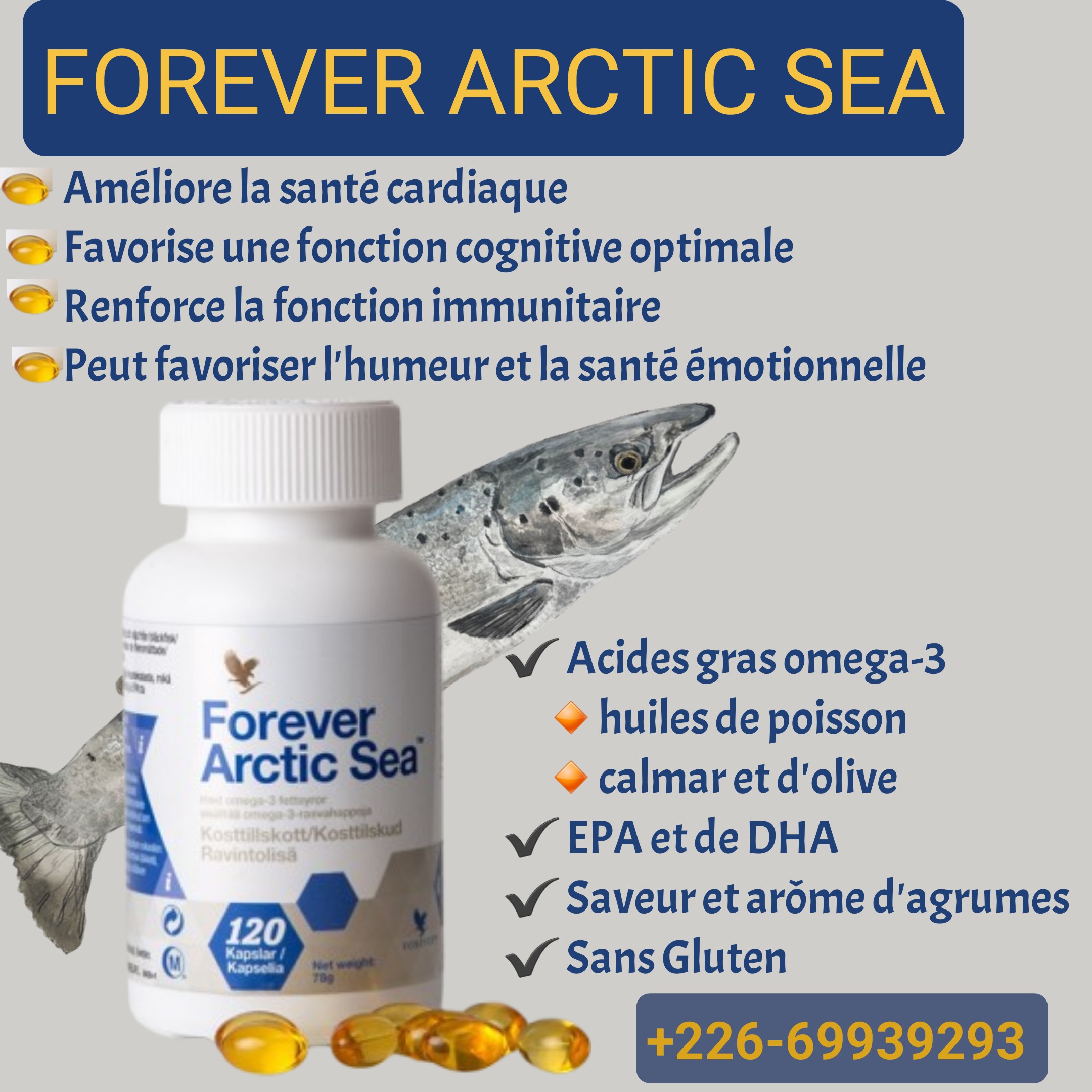 Forever Arctic Sea® contient un mélange d’huiles pour vous offrir un supplément d’oméga-3 parfaitement équilibré. Le poisson, le calamar et l’huile d’olive à haute teneur en acide oléique contribuent au bon fonctionnement de votre organisme, notamment pour les systèmes cardiovasculaire, digestif, immunitaire, cérébral et oculaire.