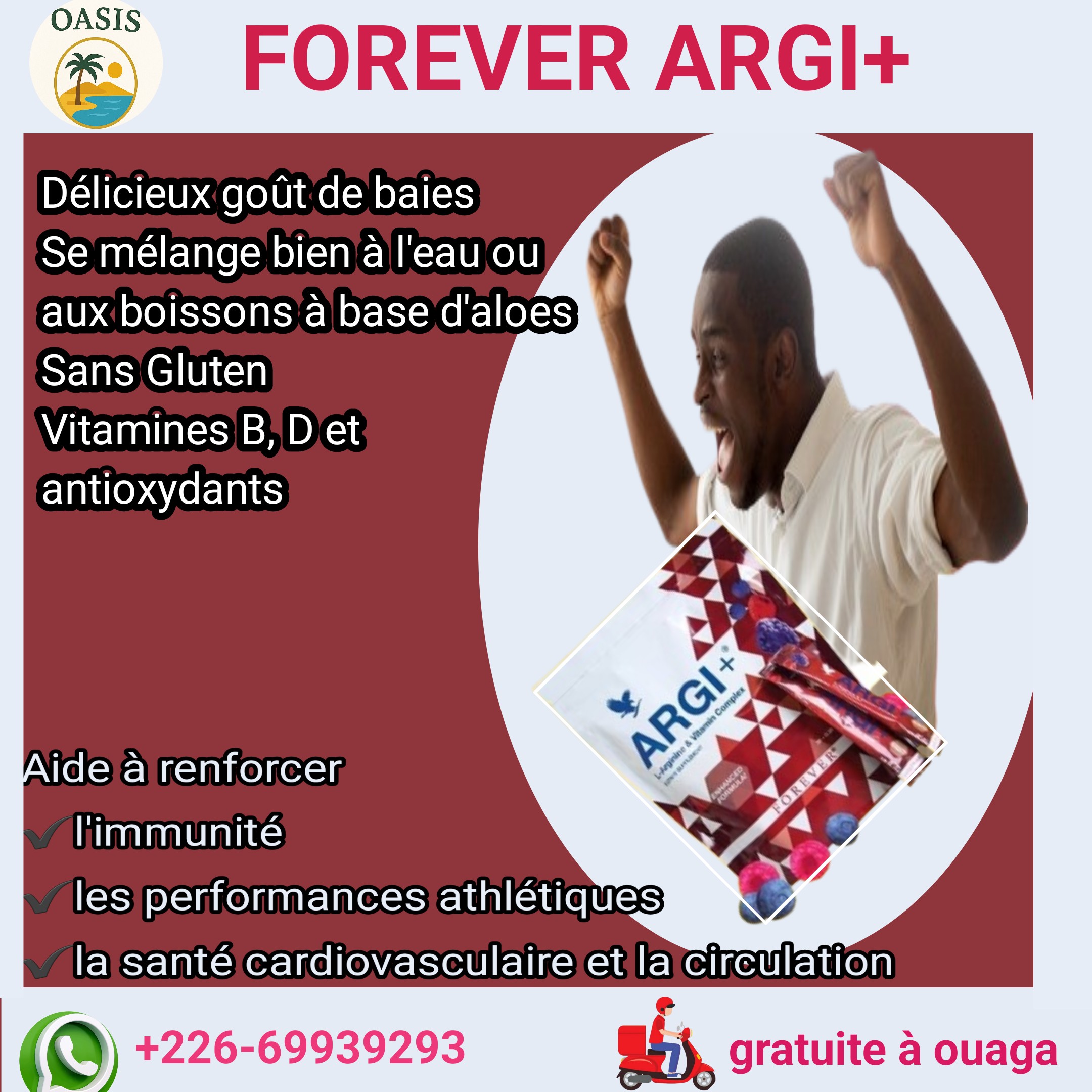 Forever ARGI+ fournit 5 grammes de L-Arginine par portion ainsi que des vitamines pour donner au corps tonus et endurance.