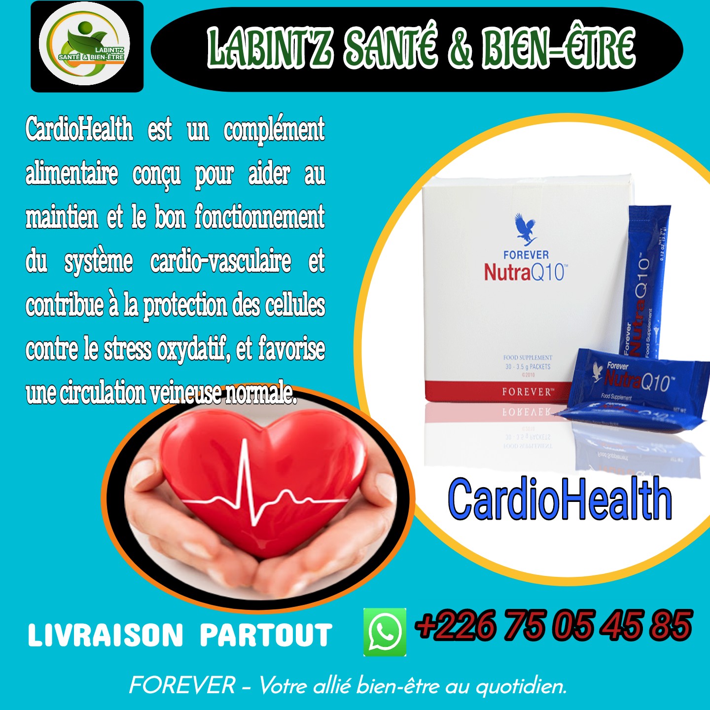 CardioHealth est un super Complément Alimentaire qui pour la prise en charge d’amélioration la circulation sanguine veineuse et également le maintien et le bon fonctionnement de la fonction cardiaque en corrigent les problèmes tels que : les palpitations,les maux de cœur, la faiblesses respiratoire, les essoufflement, le stress, lees maux de tête du au stress et la fatigue. CardioHealth est recommandé pour type de mal lier au cœur. D’autres compléments alimentaires peuvent s’ajouter à CardioHealth pour les cas spécifiques.