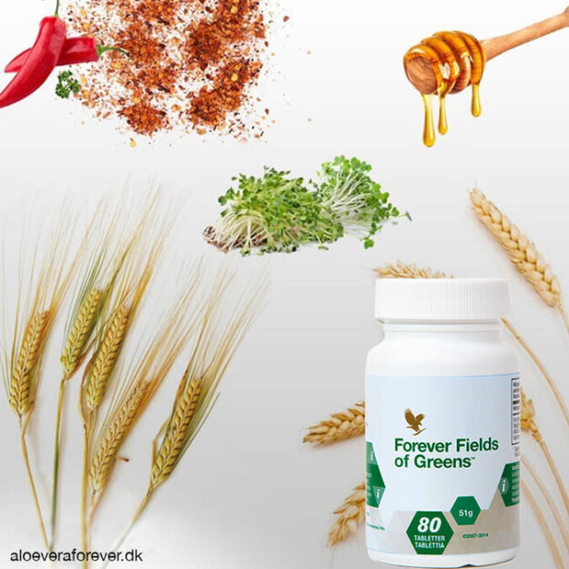 Fields of Greens™ est obtenu à partir de jeunes pousses végétales : feuilles d’orge, de blé, de luzerne et de piments de Cayenne. La luzerne, les jeunes pousses de blé et d’orge encore vertes contiennent des vitamines A, B et C ainsi que du calcium et du potassium. Ces 3 actifs végétaux contiennent également des fibres, reconnues pour favoriser le transit intestinal.