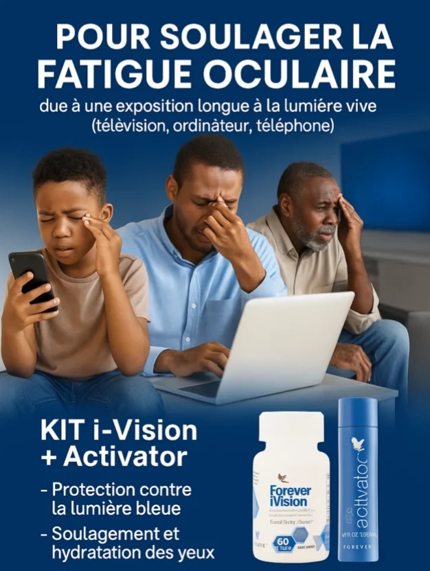 L’exposition quotidienne à la lumière des téléphones portables, des ordinateurs et de la télé affecte sérieusement les yeux. Qu’il s’agisse d’enfants qui passent leur temps à jouer sur leur tablette, ou d’un cadre d’entreprise ou d’employé modèle qui veille sur son ordinateur pour réaliser des performances ou d’un parent retraité qui trouve distraction et informations à la télé, nos yeux subissent tous les jours la lumière vive. Ce qui les affecte, les faiblisse et leur donne une certaine tension. Heureusement, un accompagnement efficace pour soulager ces yeux existe. D’où ce puissant KIT constitué de I-vision et de l’Activator de FOREVER.